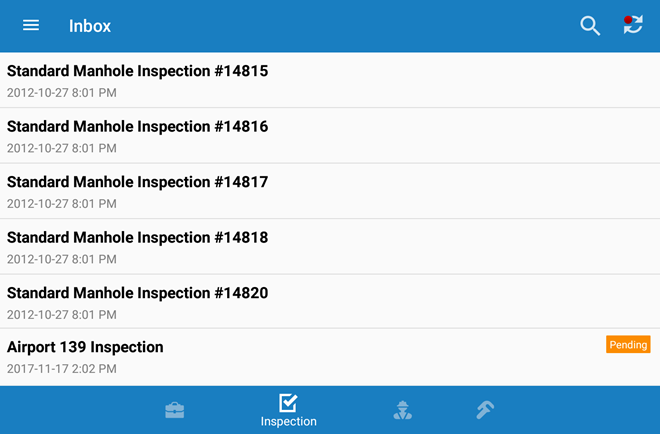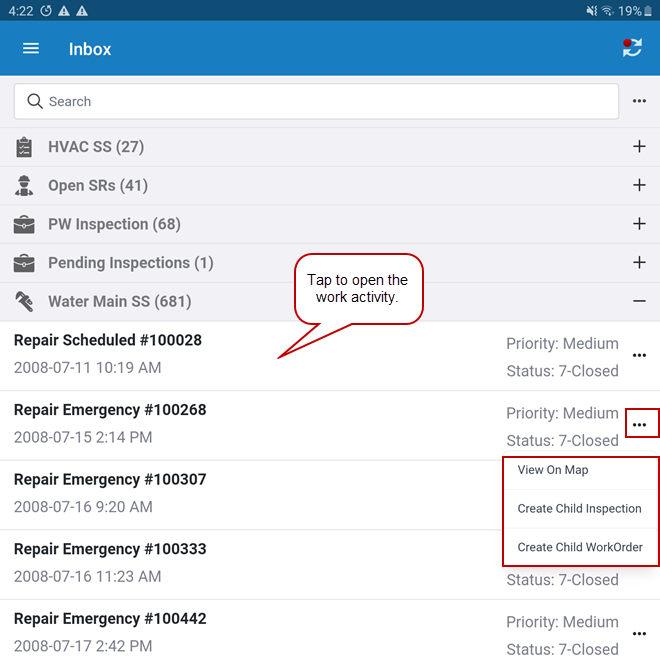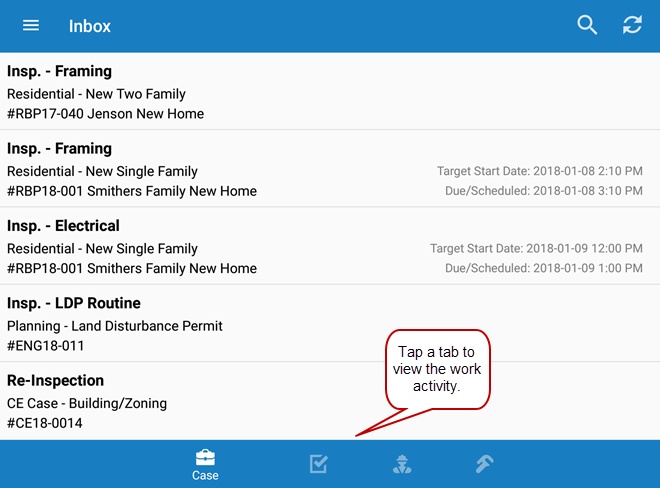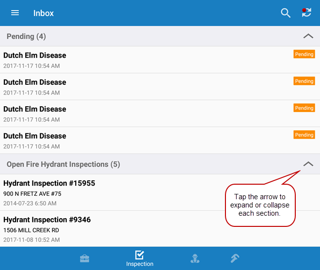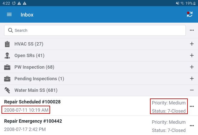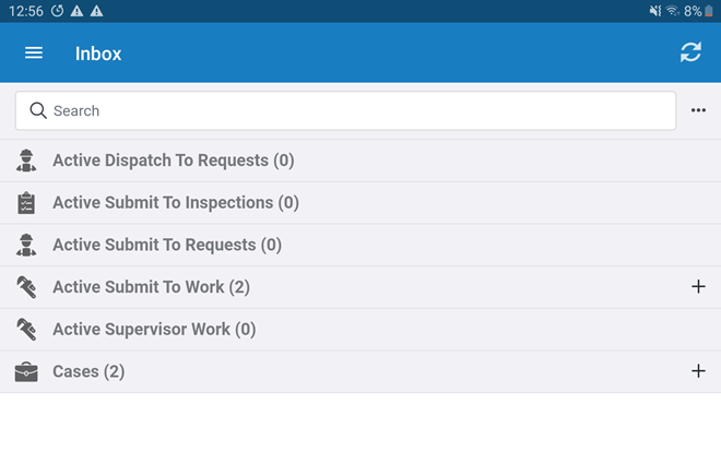 The inbox displays cases, service requests, inspections, and work orders in collapsed lists.The work activities are grouped by saved searches, if any have been added to the user or domain. A Pending section lists any pending work activities that have been created in the app but haven't been synced. You can filter the inbox by typing the first few letters of the work activity in the search box at the top.