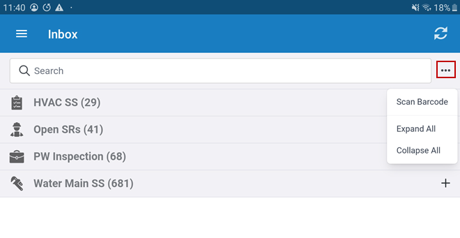 - Tap the more icon next to the search bar to scan a barcode, expand all the work activity panels, or collapse all the work activity panels.