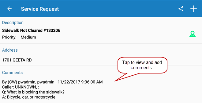 Any comments related to the service request are displayed in the Comments section, as well as any questions that have been answered in Office.