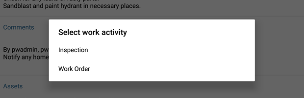 - Tap the add icon in the upper-right corner and tap Inspection on the Select work activity window to create an inspection.