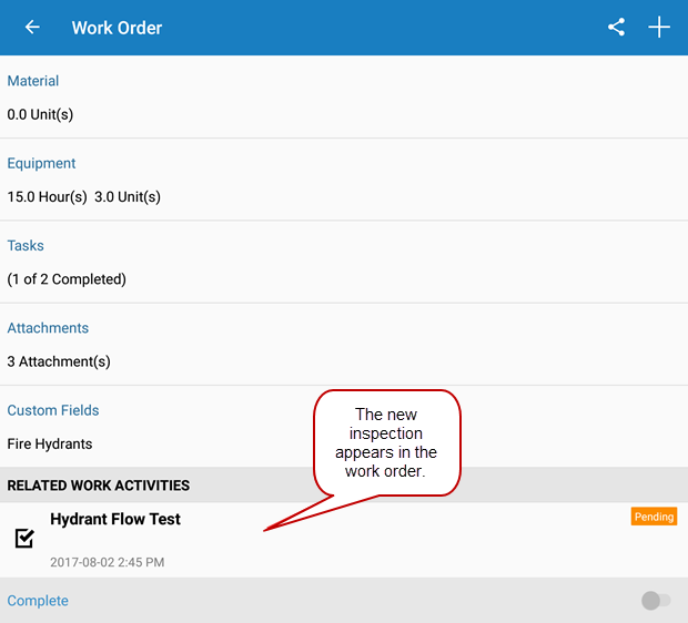 Once the inspection is created, it appears at the bottom of the work order in the Related Work Activities section.