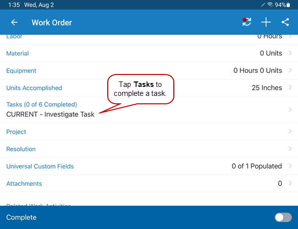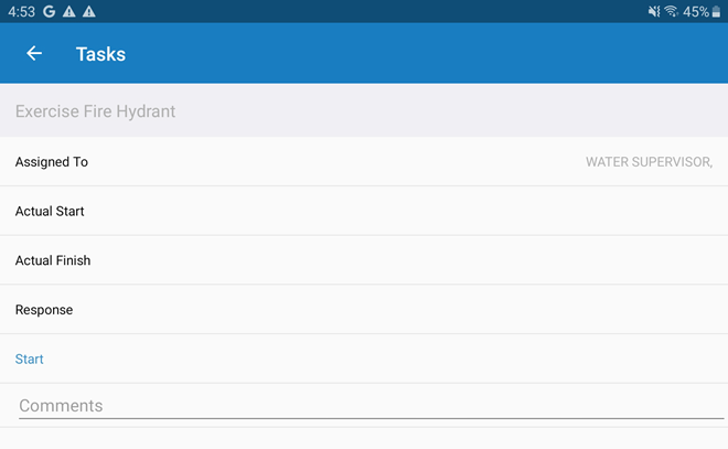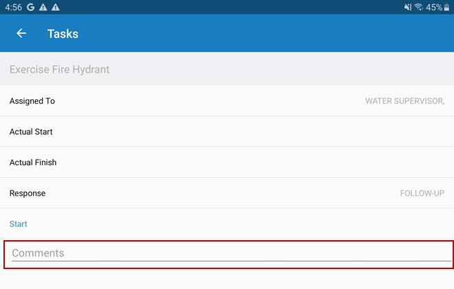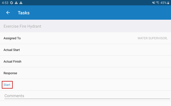 2. Tap Tasks to view the tasks, populate the actual start and finish times, and leave comments about the tasks.