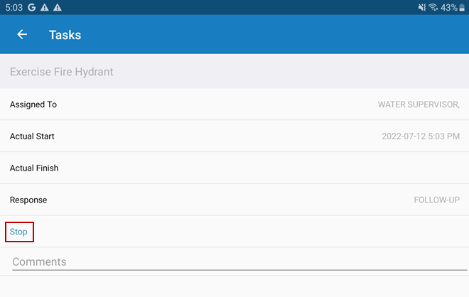 1. Alternatively, tap Start to populate the current date and time, then tap Stop when the task is complete to populate the actual finish date and time.