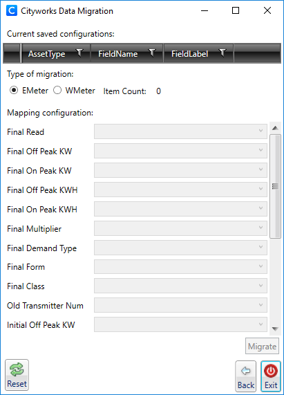 There are two columns under the Mapping configuration section of the Equipment Changeout Migration tool. The left column of text shows the existing Desktop fields for the type of migration—in the preceding image, these are the existing fields for the EMeter change out; and the right column contains the Office fields. Select where you want to configure a change out from the Desktop field to the corresponding Office field using the drop-down lists.