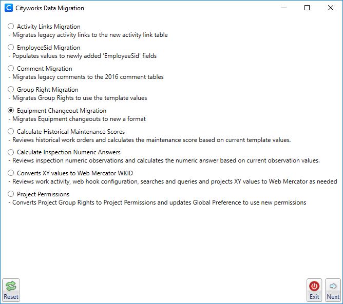 The Equipment Changeout Migration tool provides a smooth transition when users update from Desktop to Office. The Equipment Changeout Migration tool allows you to migrate the change out data from Desktop database fields to the Cityworks database fields. The Equipment Changeout Migration only needs to run once when upgrading to Cityworks 2013 or newer.