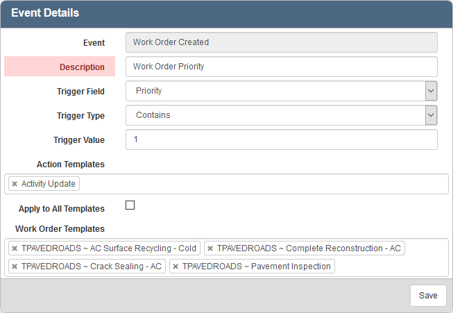 - To create a specific event, define the trigger by populating the Trigger Field, Trigger Type, and/or Trigger Value fields. For example, select priority as the Trigger Field, Contains as the Trigger Type, and enter 1 as the Trigger Value to trigger an activity update to occur if the priority of a work activity is 1.