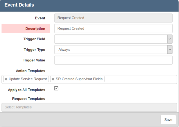 - To trigger an action to always occur when the selected event happens, select Always as the trigger type. For example, if the event you chose is Request Created and the Trigger Type is Always, an action will be triggered whenever a request is created.