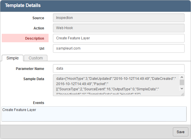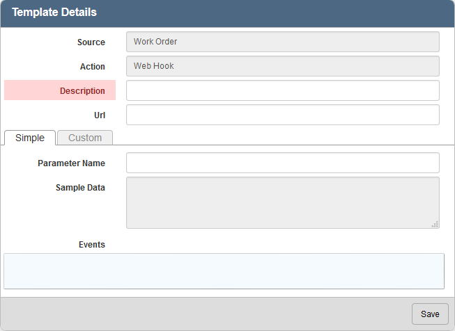 There are two tabs on the Template Details panel that you can use to configure the Web Hook, the Simple tab and the Custom tab.