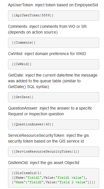 The properties included in the template will be replaced with real Cityworks data once the action is triggered according to an "order of operations" algorithm. The replace order is ``property``, ~~property~~, {{property}}.