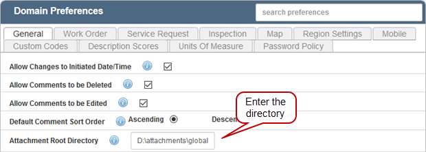- On the General tab, enter the file path for the folder where attachments are stored in the Attachment Root Directory field.