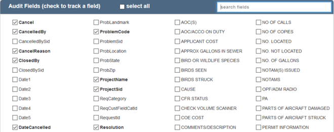 You can select which fields are tracked for service requests, work orders, inspections, contracts, and projects in the Audit Log in the respective tab. By default no Audit Fields are selected to be tracked.