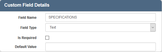 - Select it and finish editing the details of the custom field in the Custom Field Details panel. For more information on adding a specific type of custom field, see Add a Text Custom Data Field, Add a Code Custom Data Field, Add a Date Custom Data Field, and Add a Numeric Custom Data Field.
