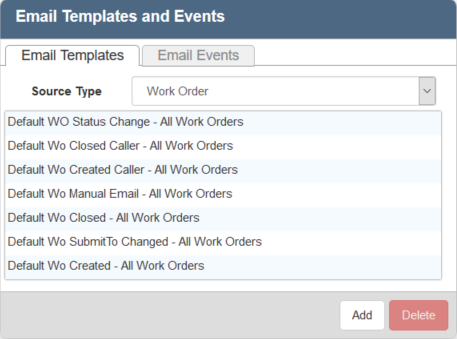 - Click Add on the Email Templates tab to create templates related to work orders, service requests, inspections, and comments.