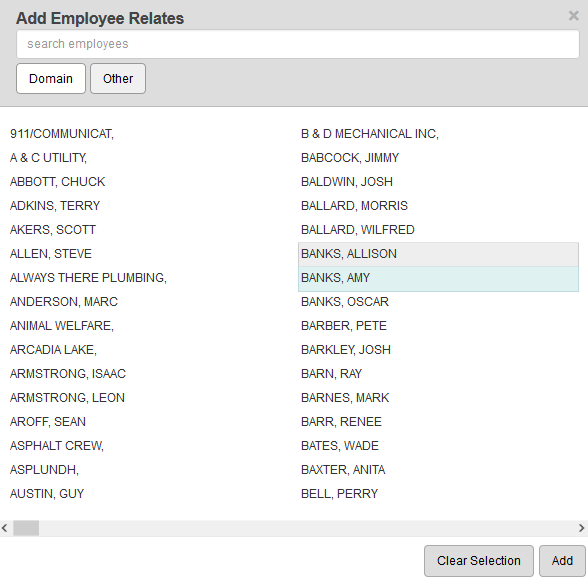 - Select the employee(s) from the list. You can filter the list by typing the first few letters of the employee's name in the search box at the top. Optionally use <Shift + click> or <Ctrl + click> to select multiple employees.