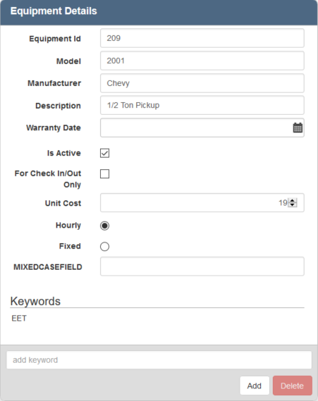 Add or update equipment to add to a work order. You can add keywords to equipment to make it easy to search.