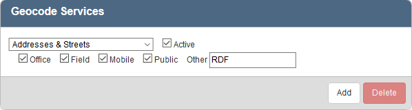 - To add a new geocode service, click Add on the Geocode Services panel.