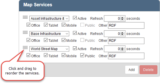 IMPORTANT: The order of these services is important because the services draw in the order that they appear in this panel, meaning the first layer draw on top, the second layer below that and so on. More transparent layers, like asset layers, should be placed at the top and more solid layers, like world imagery and TPK files, should be at the bottom so they don't cover up other layers.