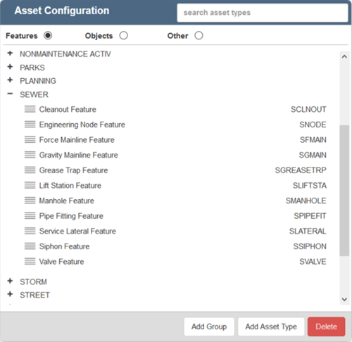 - Select an asset group from the Asset Configuration panel and click Add Asset Type to add an asset type to that asset group.