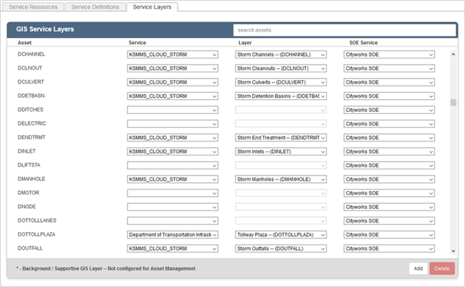 NOTE: *-Background/Supportive GIS Layer- Not Configured for Asset Management indicates that the layer isn't defined as an asset in Cityworks but can still be used for service request questions and answers, as well as service request, work order, or inspection map layers.