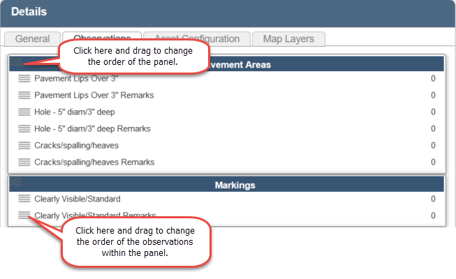 You can rearrange observations to determine how they display in Cityworks on the inspection.