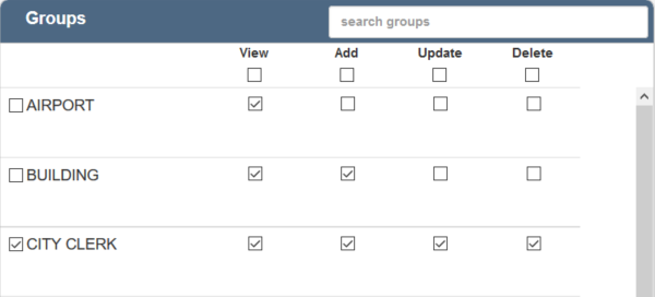 - Select the appropriate permissions for each group for View, Add, Update, and Delete. You can also select the check box to the left of the group name to assign all the permissions to that group. Alternatively, select the check box directly below View, Add, Update, or Delete to give that type of permission to all groups.