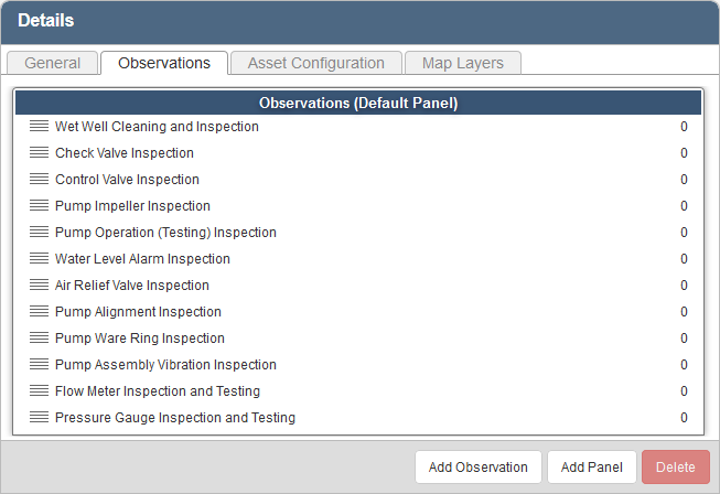 Observations are the possible questions related to the inspection. Weights are assigned to each question, which are used to calculate the Condition Score. Linear observations display all observation panels at once, including the observations within and their corresponding answers, to allow the user to quickly fill in the details of the inspection.