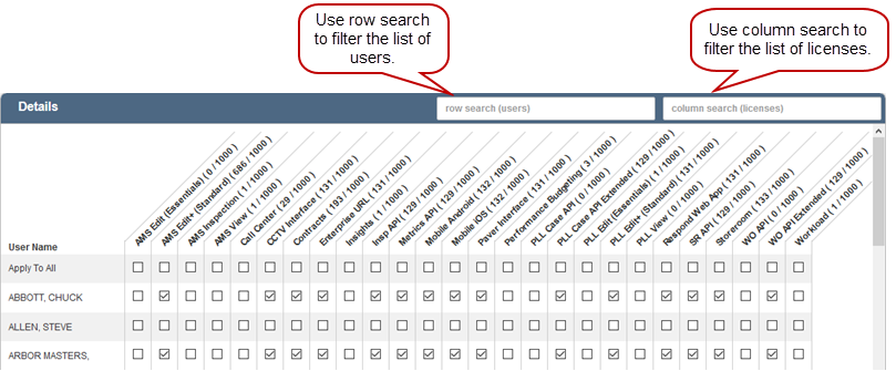 The Details panel lists each user and the rights of each user. You can filter this panel by typing the first few letters of the user's name in the row search (users) box at the top of the panel, or by typing the first few letters of the license in the column search (licenses) box in the top-right corner of the panel.