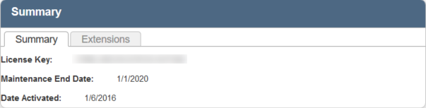 The Summary panel has two tabs: the Summary and Extensions tabs. The Summary tab lists your License Key, the Maintenance End Date, and the Date Activated.