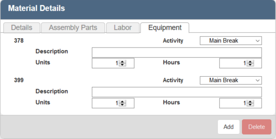 NOTE: The number entered in the Hours field for equipment will be multiplied by the number of units entered for the estimated material when added to a work order. For example, if 2 is entered into the Hours field here and 3 is entered in the Units field for the estimated material on a work order, the hours for the equipment will be 6. The number of units does not change.