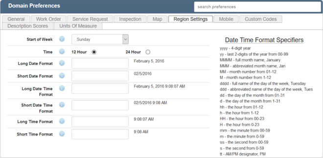 The Region Settings tab allows you to change the default format the default format for dates and times displayed in Cityworks.