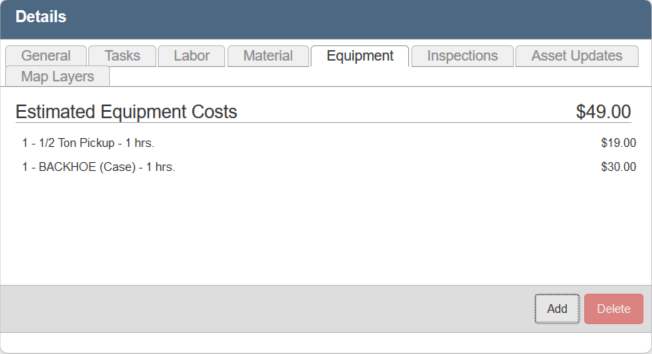 Employee or contractor equipment can be added to the work order template so that it is automatically included on any work order created from the template. The equipment costs are listed on the work order as an Estimated cost, which, if accurate, can be moved to the Actual cost.