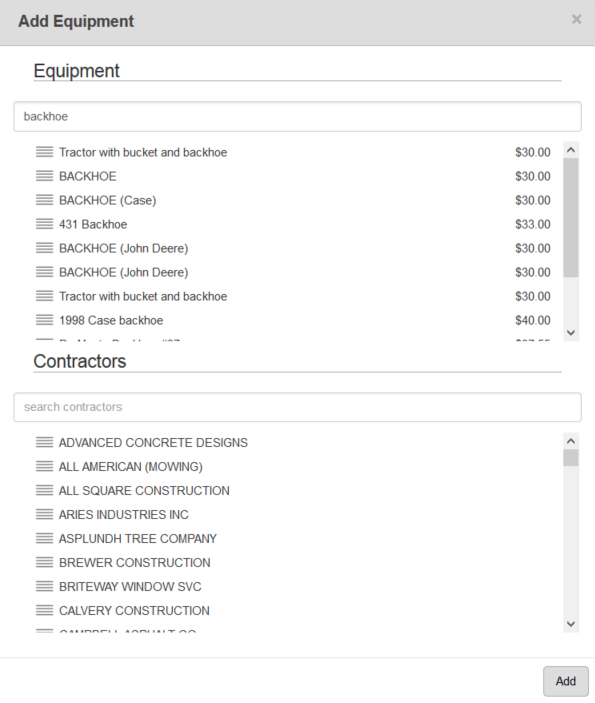 The Equipment and Contractors lists can be filtered by typing the first few letters or numbers of the equipment or contractor name in the search boxes.