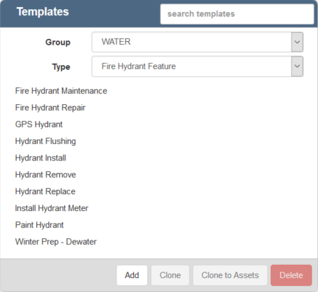 - To add a work order template first select the appropriate asset Group and Type you want the work order template to be associated with.