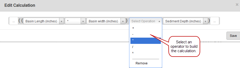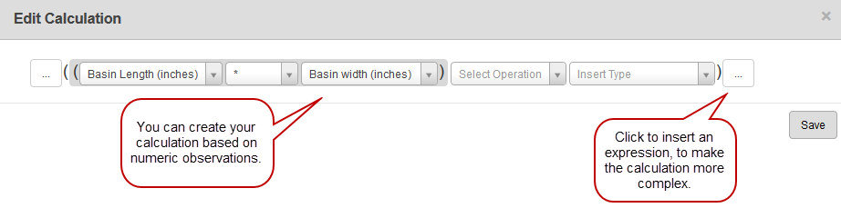 - In the Edit Calculation panel, create the calculation by selecting values from the drop-down lists. To create the calculation you can choose to insert numbers, or answer values based on observation answers entered at the time of the inspection, along with an operator (+, -, *, /, ^). You can insert additional expressions, a group of numbers or variables along with an operator, such as (2 + 5), to create a more complex calculation.