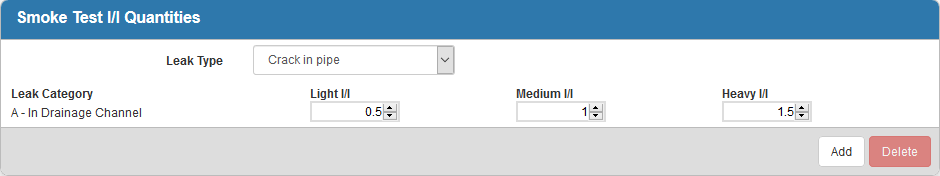 - To add a Leak Category, select the Leak Type and click Add on the Smoke Test I/I Quantities panel.