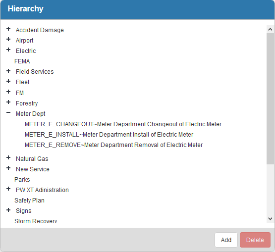 The Hierarchy panel is used to organize the tasks into categories to make them easy to find when adding a task to a work order, or to find a task when searching for a work order based on the associated tasks. A task can reside within more than one category.