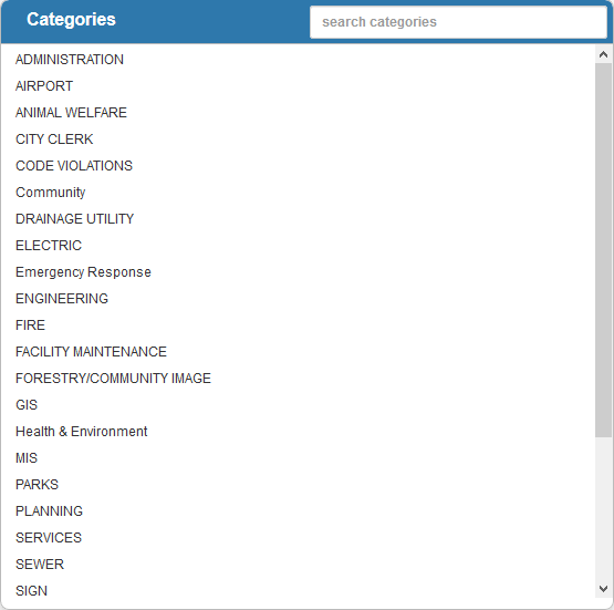 The Categories panel lists all of the service request categories. You can filter the list by typing the first few letters of the category in the search box in the top-right corner.