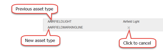 The Reassign Asset Types page lists all the defined asset types and allows the asset types to be changed by remapping them to the geodatabase. This is a global change to the asset definition. When changing the asset type, the following tables are updated: