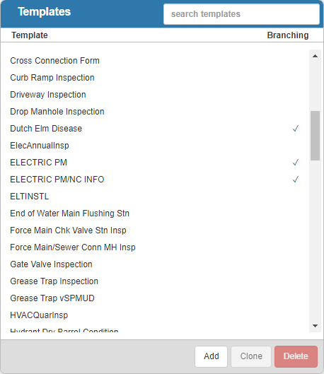 The Templates panel lists existing inspection templates. A check mark appears to the left of the template in the Branching column to indicate that the template is branching. Any templates that are inactive appear grayed out in the list. You can filter the list by typing the first few letters of the template in the search box in the top-right corner.