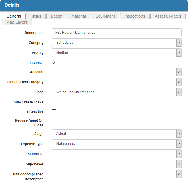 For an explanation of fields on the General tab, see Work Order Template Fields.