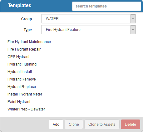The Templates panel lists all of the work order templates. Any templates that are inactive appear grayed out in the list. You can filter the list by typing the first few letters of the template in the search box in the top-right corner.