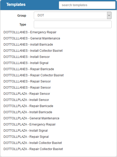The Templates panel lists all the work order templates. You can filter the list by typing the first few letters of the template in the search box in the top-right corner, or by selecting a Group and Type to filter the templates by asset group and type.