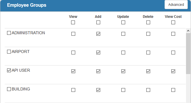 - Select the appropriate permissions for each group for View, Add, Update, Delete, and View Cost. You can also select the check box to the left of the group name to assign all the permissions to that group. Alternatively, select the check box directly below View, Add, Update, Delete, or View Cost to give that type of permission to all groups.