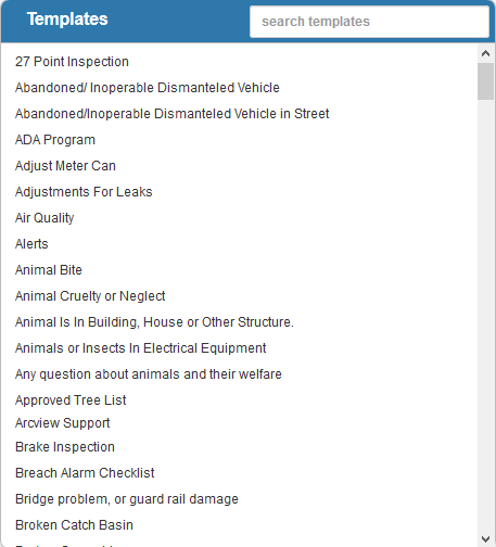 The Templates panel lists all of the service request templates. You can filter the list by typing the first few letters of the template in the search box in the top-right corner.