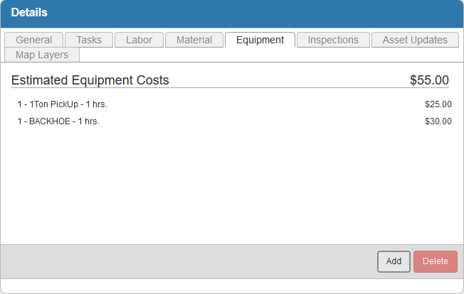 Employee or contractor equipment can be added to the work order template so that it is automatically included on any work order created from the template. The equipment costs are listed on the work order as an Estimated cost, which, if accurate, can be moved to the Actual cost.