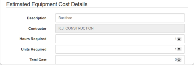 - If you select a piece of equipment associated to a specific contractor, enter the number of Hours Required, Units Required, and the Total Cost of the equipment for the template.