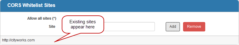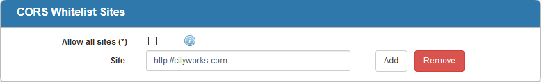 Add sites to the whitelist that you want to interact with and know are safe, such as third-party integrations. Only the sites listed will be allowed to interact with Cityworks. Any site that doesn't match the scheme, host, or port of a whitelisted origin will be rejected.