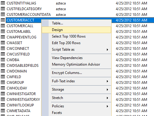 - In the list of tables in the main panel, scroll down to the CustomerAcct table.