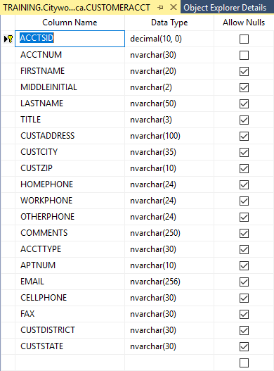 - The list that opens shows the fields in the CustomerAcct table and the lengths for each field.
