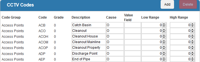 - Enter the Code Group, Code, Grade, Description, Cause, Value Field, Lo Range, and H Range.